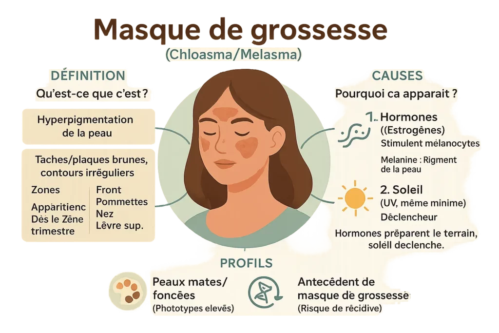 Marre de voir des taches brunes squatter votre visage depuis votre grossesse ? 😩 Le masque de grossesse visage, ce traître hormonal, touche 50 à 75 % des futures mamans, surtout à partir du deuxième trimestre. Résultat d’un cocktail œstrogènes + soleil 🌞, il s’invite sans prévenir sur le front, les pommettes ou la lèvre supérieure. On vous explique pourquoi ces zones réagissent, comment les prévenir (spoiler : une crème SPF 50+ est VITALE) et les erreurs à éviter pour ne pas aggraver le phénomène. Prêts à transformer ce « mélasma » en simple anecdote ? 💡