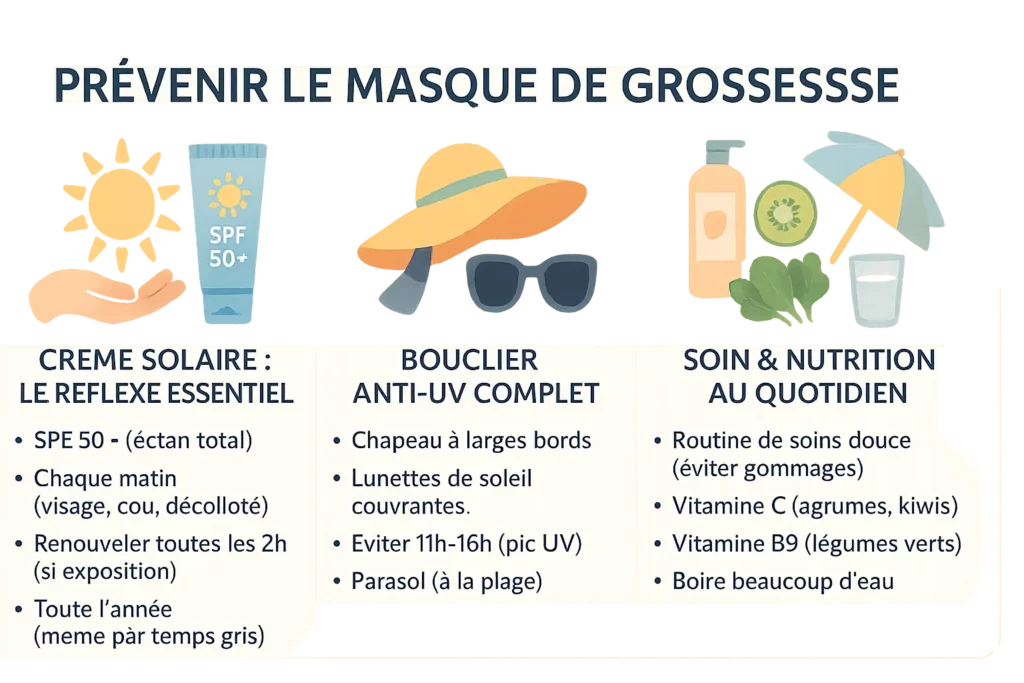 ✨ Le masque de grossesse ? Un invité passager qui s’efface souvent seul après l’accouchement ! Priorité : la crème solaire SPF 50+ pour limiter les dégâts. Si les taches s’incrustent, un dermato saura vous guider. Patience et protection, clés du succès 💡